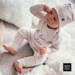 - the set includes a hat, a printed bodysuit and pants